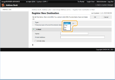 Du kan også administrere brugergruppeadresselister ved kun at give brugere med administratorrettigheder mulighed for at registrere/redigere destinationer fra Remote UI (Brugerinterface til fjernbetjening). <Brug Brugergruppes adresseliste>