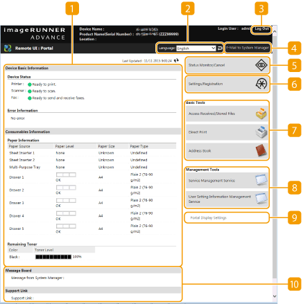 Portalsiden, der er vist herunder, vises, når du logger på Remote UI (Brugerinterface til fjernbetjening). I dette afsnit beskrives de emner, der vises på portalsiden, og den grundlæggende betjening.