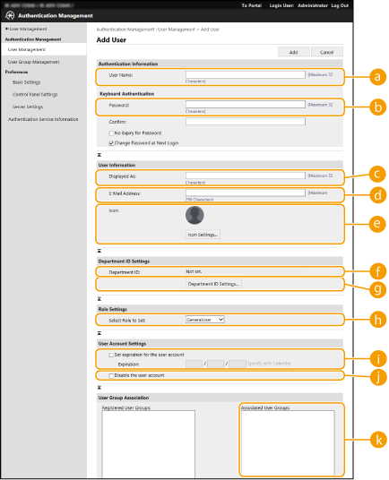 Det "Group name" (Gruppenavn), der er registreret i brugergruppeadministrationen, står her. Hvis brugeren tilhører flere grupper, er gruppenavnet forbundet med et "|".