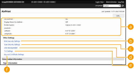 Giver dig mulighed for at kontrollere de værdier, der er angivet i AirPrint-indstillingerne, som f.eks. maskinens navn og placering. Du kan klikke på [Edit...] for at ændre indstillingerne.
