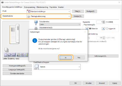 Vælg [Planlagt udskrivning] fra [Outputmetode], og klik på [Ja].