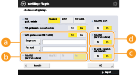 Tryk på <Til>, når du vil omdanne maskinen til en SMTP-server til modtagelse af e-mails og I-faxer. Vær opmærksom på, at du ikke kan modtage via SMTP, hvis du ikke registrerer maskinens værtsnavn på DNS-serveren.