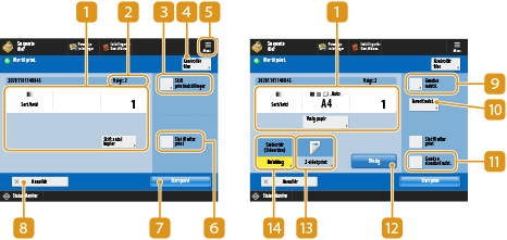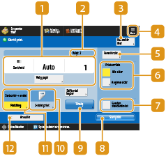 Viser indstillingsstatus, som f.eks. papirformatet, der skal printes på, og printantallet. Sørg for at tjekke indstillingerne for at printe korrekt. For at ændre indstillingerne skal du trykke på knappen under displayafsnittet. For at ændre antallet af print skal du indtaste antallet med taltasterne.