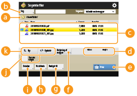 Tryk på <Navn> eller <Dato/Tid> for at sortere listen over filer og mapper efter navn eller dato/klokkeslæt i stigende () eller faldende () rækkefølge.