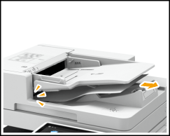 Haal de gescande originelen uit het originelenopvangblad om papierstoringen te voorkomen. Om te voorkomen dat originelen in het opvangblad blijven liggen, licht de uitvoerindicator originelen op terwijl de originelen worden uitgevoerd en knippert deze nog een tijdje nadat alle originelen zijn uitgevoerd.