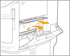 Als er papier is vastgelopen, trekt u dit voorzichtig naar buiten in de richting van de pijl.