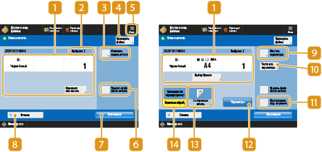 Служит для отображения состояний параметров, таких как формат бумаги для печати и количество экземпляров. Подтвердите параметры, чтобы печать была выполнена должным образом. Для изменения значений нажмите кнопку, расположенную под этой областью. Чтобы изменить количество экземпляров для печати, введите нужное число с помощью цифровых клавиш.