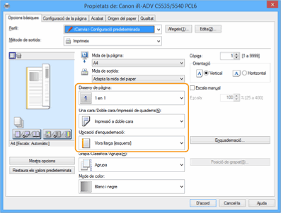 [Ordre de pàgines] [Una cara/Doble cara/Impressió de quaderns] [Ubicació d'enquadernació].