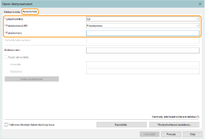 [Lisää G3-/IP-faksinumeroon ulkoisen soiton etuliite] ja lisää faksinumero [G3]-tekstiruutuun.