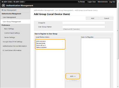 Klik på [User Management]  [Authentication Management]  [User Group Management].