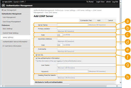 Angiv det portnummer, der bruges til kommunikation med LDAP-serveren. Brug den samme indstilling, som er konfigureret på serveren. Hvis du ikke indtaster et nummer, indstilles det automatisk til "636", når afkrydsningsfeltet er valgt for [Use TLS], og det indstilles til "389", når afkrydsningsfeltet ryddes.