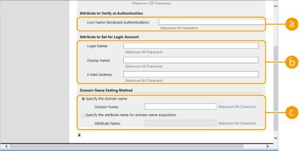 Vælg, hvordan du indstiller domænenavnet for login-modtageren. For at angive domænenavnet direkte skal du vælge [Specify the domain name] og indtaste domænenavnet. For at angive et LDAP-datafelt (attributnavn) fra hvilket LDAP-serverens domænenavn skal hentes, skal du vælge [Specify the attribute name for domain name acquisition] og indtaste (Eksempel: dc).