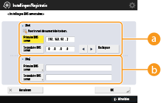Om de host- en domeinnaam zo in te stellen dat ze gelijk zijn aan IPv4, drukt u op <Aan> bij <Gebruik dezelfde hostnaam/domeinnaam als IPv4>. Om andere instellingen dan voor IPv4 op te geven, drukt u op <Uit>.