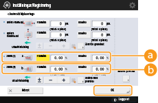 Ange förstorings-/förminskningsförhållandet (%) för <Zoom (a)> och <Zoom (b)> på skärmbilden <Justera bildplacering>  tryck på <OK>.