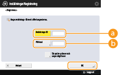 Ange ett tal med 7 siffror eller mindre för PIN-koden och tryck på <Bekräfta>. För att bekräfta, ange PIN-koden igen och tryck på <OK>. Om du inte vill ställa in en PIN-kod, lämna det här alternativet tomt.