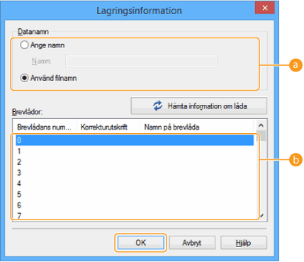 För att spara med filnamnet för data på datorn, välj [Använd filnamn]. För att ändra filnamn, välj [Ange namn] och ange ett filnamn i textrutan [Namn].