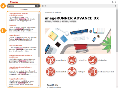 Klicka här för att få information om hur du visar Användarhandbok, gör sökningar och visar annan information.
