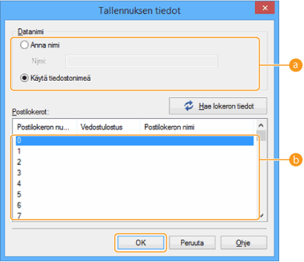 Laitteeseen tallennettua lokeron nimeä voi käyttää tulostinajurissa. Tietoja, katso tulostinajurin Ohje.