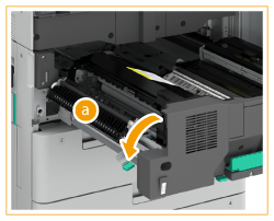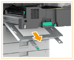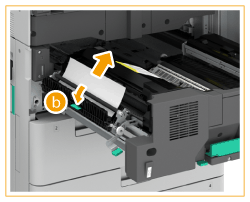 Als er papier is vastgelopen, trekt u dit voorzichtig naar buiten in de richting van de pijl. Zorg ervoor dat de binnenste uitvoergeleider geopend is.