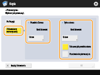 Jeżeli chcesz przesunąć obraz na tylnej stronie podczas kopiowania na obu stronach, niezbędne jest określenie ustawienia <Tylna strona>. Aby przesunąć do tej samej pozycji, co przednia strona, naciśnij na <Tak samo jak przednia strona>. Aby przesuwać symetrycznie, naciśnij na <Przeciwnie do pierwszej str.>. Aby przesunąć do pozycji innej, niż przednia strona, naciśnij na <Ustaw> i wprowadź wartość przesunięcia.