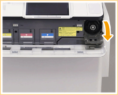 Aby otworzyć pokrywę wymiany tonera, chwyć ją po lewej i prawej stronie, a następnie pociągnij do siebie. Pokrywa wymiany (mała pokrywa) zasobnika wymagającego wymiany otworzy się.