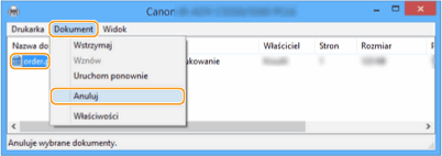 Jeżeli nie możesz odnaleźć dokumentu, który chcesz anulować, dokument został już przesłany do urządzenia. W takim wypadku, nie możesz anulować drukowania z poziomu komputera.