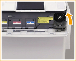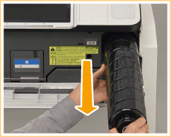 Håll i vänster och höger sida av tonerpåfyllningsluckan och dra luckan mot dig för att öppna den. Påfyllningsluckan (liten lucka) på platsen öppnas för tonern som är i behov av byte.