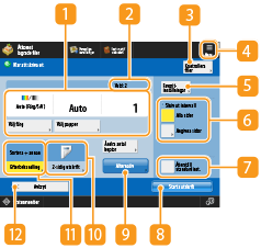 Visar status för inställningen för pappersformat för utskrift och antalet utskrifter. Kom ihåg att bekräfta inställningarna för att skriva ut på rätt sätt. För att ändra inställningarna, tryck på knappen under skärmbildsdelen. Om du vill ändra antalet utskrifter, anger du värdet med sifferknapparna.