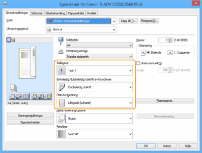 [Sidordning] [Enkelsidig/dubbelsidig/utskrift av broschyrer] [Plats för bindning].