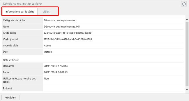 Sur la page [Détails du résultat de la tâche], vous pouvez cliquer sur l'onglet pour changer l'affichage.