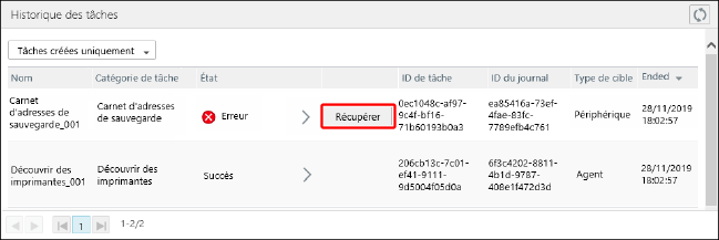 Si [Erreur] ou [Expiration du délai] est affichée pour [État] pour une tâche créée par un utilisateur, une tâche de récupération peut être créée pour exécuter de nouveau la tâche.