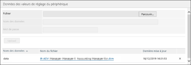 Données de valeurs de réglage du périphérique exportées depuis le Plug-in de Gestion de configuration de périphérique utilisé sur iW Management Console v3.x
