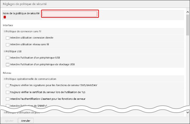Dans la page [Réglages de politique de sécurité], saisissez un nom indiquant le contenu de la politique de sécurité dans [Nom de la politique de sécurité].