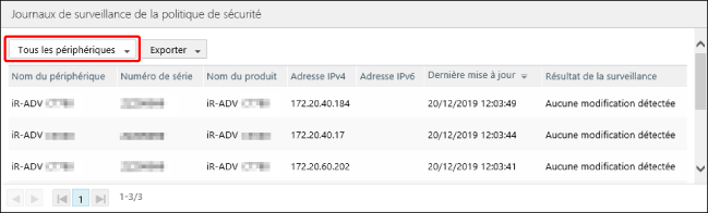 Sélectionnez l'imprimante souhaitée dans la liste de la page [Journaux de surveillance de la politique de sécurité].