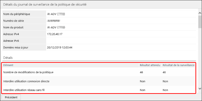 Sur la page [Détails du journal de surveillance de la politique de sécurité], vous pouvez vérifier le résultat de la comparaison de chaque élément aux valeurs de la politique de sécurité de référence et le nombre de fois que les politiques de sécurité ont été remplacées.