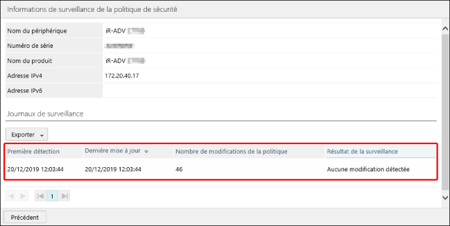 L'historique de surveillance s'affiche dans la page [Informations de surveillance de la politique de sécurité].