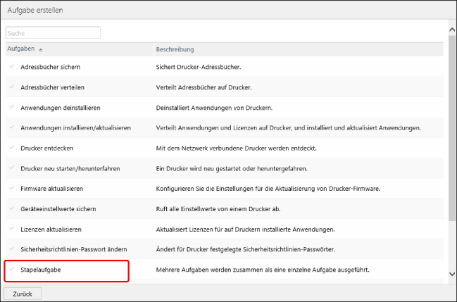 ] (Hinzufügen).[Stapelaufgabe beenden] | Wählen Sie diese Option, um den Prozess mit dem Ausführungsergebnis der Stapelaufgabe als "Erfolg" zu beenden, ohne nachfolgende, eingestellte Unteraufgaben auszuführen. In Kombination mit [ ] und [ ] wird der Prozess nur für Geräte beendet, die die Bedingungen erfüllen. Die nachfolgenden Unteraufgaben werden für Geräte ausgeführt, welche die Bedingungen nicht erfüllen. |