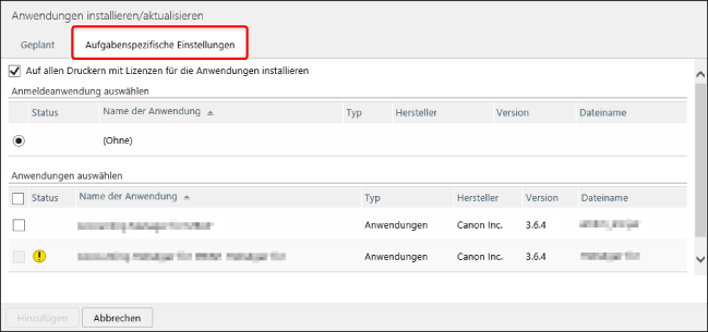 Um die Anwendungen auf allen mit der Lizenz verbundenen Druckern zu installieren, wählen Sie [Auf allen Druckern mit Lizenzen für die Anwendungen installieren] aus.