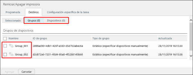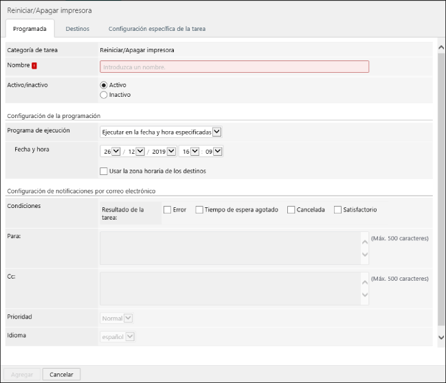 [Fecha y hora] | Especifique la fecha y hora de ejecución de la tarea. La tarea se ejecuta cuando la fecha y hora del equipo donde se ejecuta el navegador web coinciden con la fecha y hora especificadas aquí. Seleccione [Usar la zona horaria de los destinos] para usar la zona horaria de la región donde se encuentran los dispositivos de destino o agentes de la tarea. |