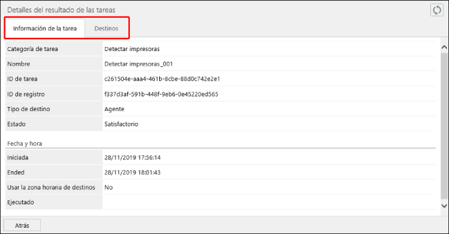 Puede comprobar el resultado de la ejecución de cada dispositivo de destino o agente.