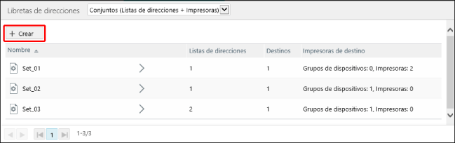Haga clic en [Crear] en la página [Conjuntos (Listas de direcciones + Impresoras)].