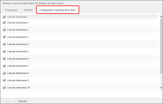 Seleccione las listas de direcciones de las impresoras de las que desea hacer una copia de seguridad.