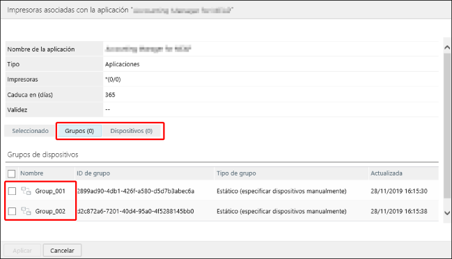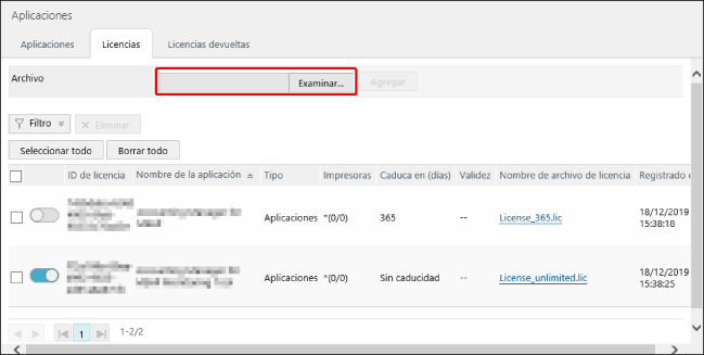 [Nombre de la aplicación] | Muestra el nombre de la aplicación. Si la aplicación correspondiente a un archivo de licencia no está registrada en este software, se muestra el ID de aplicación. Sin embargo, incluso si una aplicación no está registrada en este software, puede ser que se muestre el nombre de la aplicación si se trata de una aplicación conocida (por ejemplo, una opción de impresora). |
