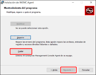 Si no dispone del instalador que se usó para instalar el agente, desinstálelo en [Configuración] > [Aplicaciones y características] > [iW Enterprise Management Console Agent] en Windows. |