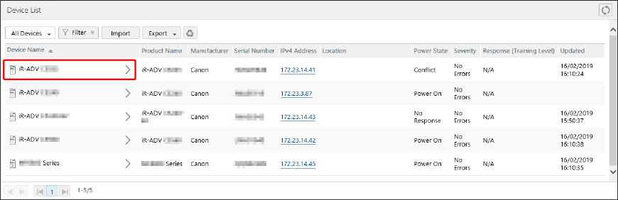 [To Detailed Status] | 显示设备的 [Detailed Status] 页面。 [Detailed Status] 页面与在 [Device List] 页面上单击 [Power State]、[Severity] 或 [Response (Training Level)] 时显示的页面相同。 |