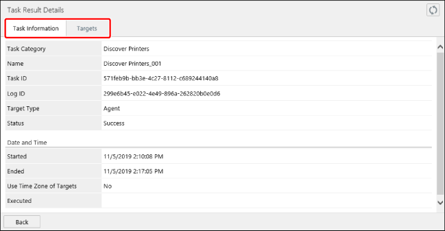 [Targets] 选项卡 | 显示每个目标设备或 Agent 的历史记录。 您可以在 [Target Details] 页面上单击列表中的状态以检查每个目标的详细执行状态。 对于批任务,[Status] 显示最后执行的子任务的执行结果。因此,即使批任务的 [Status] 显示为“Success”,在最后一个子任务之前执行的子任务也可能是以错误结束。 批任务各个子任务的执行结果显示在 [Target Details] 页面上的 [Task List] 中,如下所示。 有图标 [  ]:Success [  ]:Error [  ]:Timeout [  ]:Executing 没有图标 白色背景:Pending 灰色背景:Canceling |