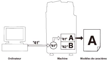 Lorsqu'on imprime la lettre A, l'ordinateur hôte envoie un code correspondant à la lettre A (le code hexadécimal 41 dans ce cas) à la machine. Ce code est appelé code de caractère. La machine stocke une représentation interne pour chaque caractère et sélectionne parmi ces modèles de caractères, celui correspondant au code reçu. Dans ce cas, la machine recherche le modèle correspondant à la lettre A et l'imprime. Processus d'impression des lettres.