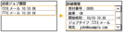 <ジョブ履歴表示のON/OFF>が<OFF>に設定されていると、送信履歴は確認できません。<ジョブ履歴表示のON/OFF> |