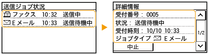 送信状況を確認する1 | <ジョブ状況>を選び、状況を確認したい文書を選ぶ ![]() 文書の詳細情報が表示されます。 文書の宛先が複数指定されている場合は宛先の件数が表示されます。複数指定の宛先を確認するときは<宛先>を選んでください。 |