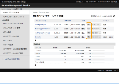 MEAPアプリケーションやシステムアプリケーションが使用しているストレージの領域やメモリーなどの使用量、残量、使用率が表示されます。